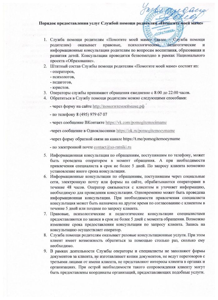 1. Служба помощи родителям «Помогите моей маме» (далее – Служба помощи родителям) оказывает правовые, психологические, педагогические и информационные консультации родителям по вопросам воспитания, образования и развития детей. Консультации проводятся безвозмездно в рамках Национального проекта «Образование».
