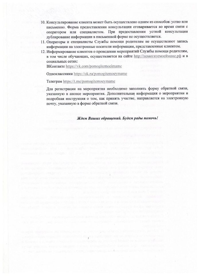 12. Информирование клиентов о проведении мероприятий Службы помощи родителям, в том числе обучающих, осуществляется на сайте https://помогитемоеймаме.рф и в социальных сетях: